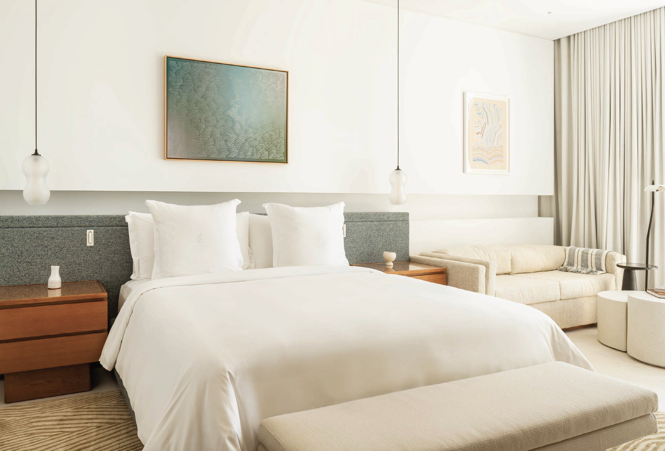 Digital and silkscreen print on fabric over the bed and a limited edition silkscreen print with artist Karin Haas above the sofa.