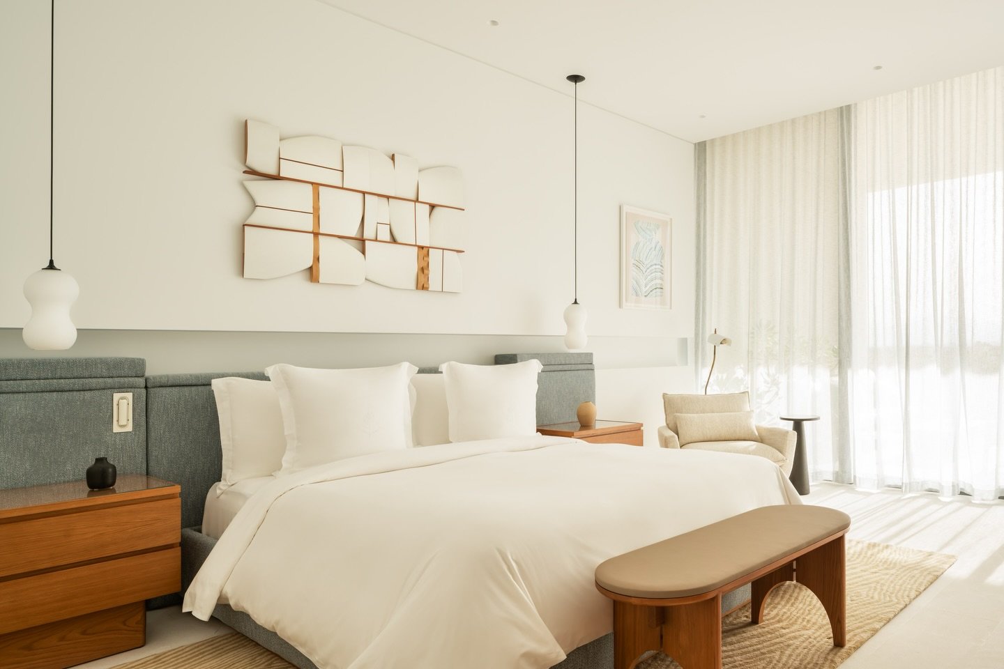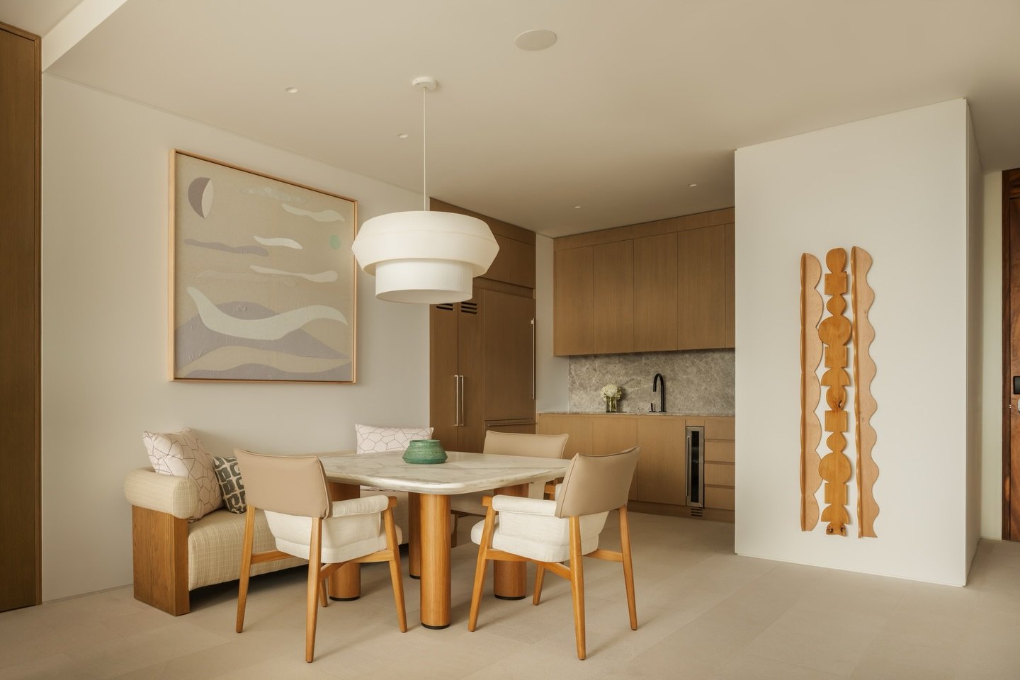 Engaged early in the design process, we acted as creative partners to the interiors team, ensuring that commissions amplified key architectural moments while maintaining flexibility for installation. The art packages for the 36 residences included large-scale paintings, works on paper, sculptural wall reliefs, and textile pieces. Each respond to the particular spatial and conceptual qualities of living at the intersection of land and water.