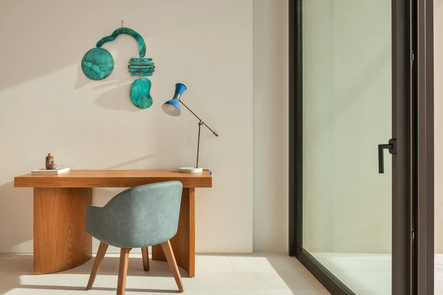 Custom patina brass wallhanging sculpture by Sarah Perez over the desk and a limited edition silkscren print with artist Tyler Keeton Robbins at the end of the hallway.